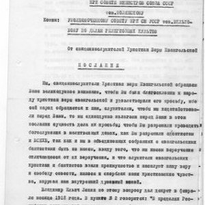 A letter-message (copy 2) from non-registered churches of Christians of Faith Evangelical (CFE) under the direction of Afanasii I. Bidash, 1956 October 12, to I.V. Polyanskiy, a chairman of the Religious Cults Council of USSR. [Description English/roman)] Письмо-послание (копия 2) от не регистрированных церквей ХВЕ под руководством Афанасій И. Бидаша, 1956 октябрь 12, Председателю Совета по религиозным культам СССР, И.В. Полянскому. [Description (original non-English/roman language/script)]