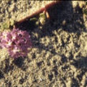 Close-up of pink flowers in sand in front of a twig near Mecca Beach.