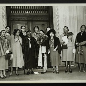 Photograph of Arenia C. Mallory (4th from left) with Mary McCloud Bethune and the National Council of Negro Women, Washington, DC, [s.d.]. "Fred Harris, photographer, 1829 Jackson Street, N.E., Hobart 2-1718" -- stamped on back. [Description English/roman)]