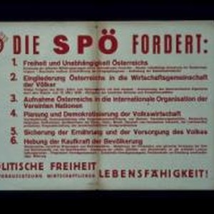 Die SPO fordert: 1. Freiheit und Unabhangigkeit Osterreichs. ... 2. Eingliederung Osterreichs in die Wirtschaftsgemeinschaft der Volker. ... 3. Aufnahme Osterreichs in die internationale Organisation der Vereinten Nationen. ... 4. Plannung und Demokratisierung der Volkswirtschaft. ... 5. Sicherung der Ernahrung und der Versorgung des Volkes. 6. Hebung der Kaufkraft der Bevolkerung. ... Politische Freiheit ist Voraussetzung wirtschaftlicher Lebensfahigkeit!
