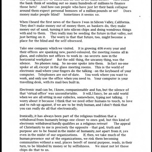 Charles Handy thought for the day on how too much technology can make workers lose the human touch in their organizations. Handy begins the article discussing the Baring's Bank fiasco and how so many people there could trust the bank to carry out its duties with so much risk. He proceeds to highlight how certain technology, such as e-mail, is creating too much distance among people, and how people need more opportunities to interact and touch in order to truly be human. Handy then comments on how Christianity prescribes that people do have contact with one another in order to arrive at the essence of God, truth, and purpose.
