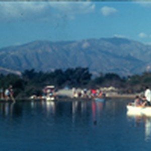 Scenic shot of students working along the shore and in boats at pHake Lake with mountains in background.