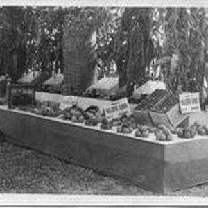Postcard, black and white: Santa Rosa District Fair, 1915. Oscar A. Hallberg & Sons display. First Prize, one ranch display.