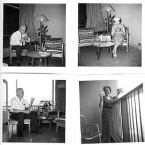 Photo--black and white: Bunni and George Streckfus in four pictures inside a hotel room, possibly Hawaii, with pineapple drinks. about 1960.