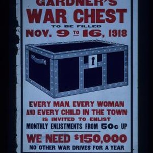 For all war charities. Gardner's War Chest to be filled Nov. 9 to 16, 1918. Every man, every woman and every child in the town is invited to enlist