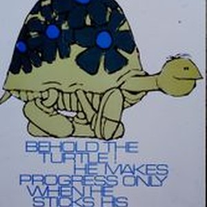 Slide, color, Kodachrome Transparency; Advertisement sign with drawn turtle and caption " Behold the turtle! He makes progress only when he sticks his neck out." James Bryant Conant Slide dated November, 1970