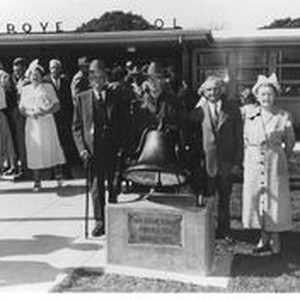 Photo--black and white: Graton's Oak Grove Grammar School 100th Centennial in 1954. People standing in front of Oak Grove School and the four people standing around school bell are the oldest living pupils of the school The man on the right standing next to the woman is Bill Hotle. The original school was founded in 1854.