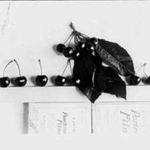 Identification of Luther Burbank cherry hybrid from the Gold Ridge Experiment Farm--single cherries (T-1, west limb) in a row with a cluster and leaves above, about 1927