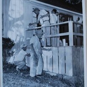Photo--black and white: Sebastopol Lions Club scrapbook photo: Group of Lions Club men painting a house. L-R: John Fore, Dick Dickenson, Ed Herring and Phil Wetch. Circa 1955.
