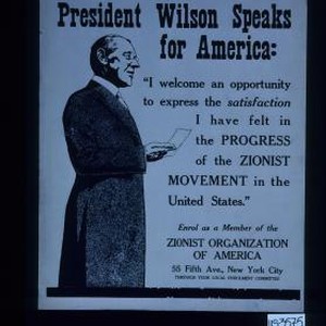 President Wilson speaks for America: " I welcome an opportunity to express the satisfaction I have felt in the progress of the zionist movement in the United States." Enroll as a member of the Zionist Organization of America, 55 Fifth Ave., New York City, through your local enrolment committee