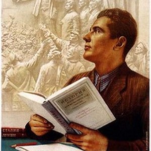 Soviet political poster. Caption reads, "Изучайте великий путь партии Ленина-Сталина! / Izuchaite velikii put' partii Lenina-Stalina!", meaning, "Study the great path of party of Lenin-Stalin!". [Description English/roman)]
