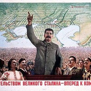 Soviet political poster. Caption reads, "Под водительством [sic] великого Сталина -- вперед к коммунизму! / Pod voditel'stvom velikogo Stalina -- vpered k kommunizmu!", meaning, "Under the leadership of the great Stalin, move forward -- towards communism!". [Description English/roman)]
