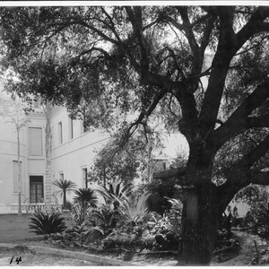 View of trees and plants in front of the north façade of the residence. North entrance is just out of frame on the left. The label that accompanies this photo in the album reads "No. 14, about 1912, Palms, cycads and other ornamentals - north court - Henry E. Huntington residence." For another copy, see photCL 107 vol7 (21).