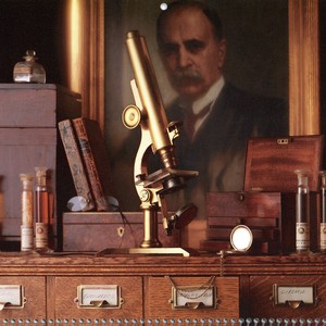 Scope/Content: May image titled Sir William Osler from a 1990 calendar titled Advances in Healthcare; items pictured are from the University of California, San Francisco Archives, Health Sciences Artifact Collection; calendar copyright 1989 Harwood Co.; portrait of Sir William Osler, microscope and slides, card catalog, pocket watch.