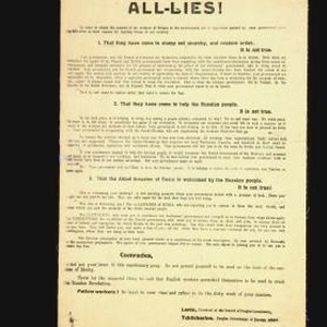 All-lies! In order to obtain the consent of the workers of Britain to the unwarranted act of aggression against us, your government gives ... reasons for landing troops in our country. ... Comrades ... never let it be said that English workers permitted themselves to be used to crush the Russian Revolution ... signed Lenin, Tchitcherine