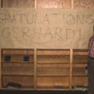 White banner with "Congratulations Gerhard" written on it and Gerhard standing in front of it.