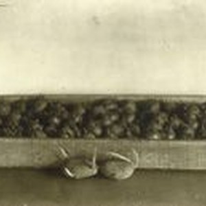 Photo--black and white: Identification of Luther Burbank potato hybrid from the Gold Ridge Experiment Farm. A flat of Burbank potatoes with two sprouted potatoes in front.