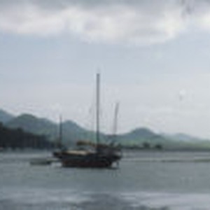 Sail boat on bay with hills and mountains in background. Slide mount lists "Hollister Peak".