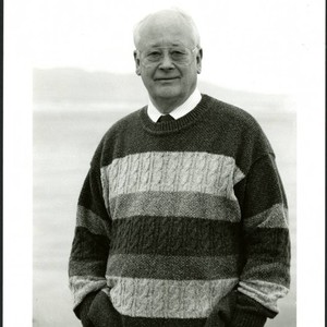 Grayscale photo of Charles Handy taken by Elizabeth Handy. Handy is standing with his arms in his pockets, against a gray background. He is wearing glasses and staring directly into the camera lens.