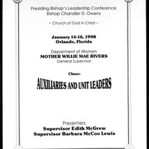 Church of God in Christ (COGIC), Department of Women, leadership conference class syllabus, "Auxiliaries and unit leaders", Orlando, Florida, 1998 January 14-16. [Description English/roman)]