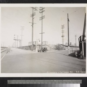 View of intersection with train tracks and an automobile in an industrial area at the corner of Alhambra Avenue and College Street near Old Chinatown in Los Angeles. Title transcribed from photograph.