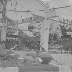 Postcard photo, black and white: 1910 Gravenstein apple Show exhibit of Luther Burbank with fruit and flowers.