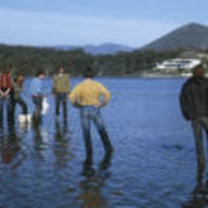 A group of students collects samples in the tidal flats with a backdrop of rolling hills and mountains.