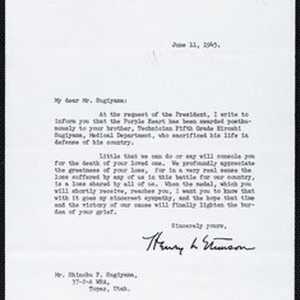 Henry L. Stimson, letter, 1945 June 11, to Shinobu P. Sugiyama. "At the request of the President, I write to inform you that the Purple Heart has been awarded posthumously to your brother…" -- first line.