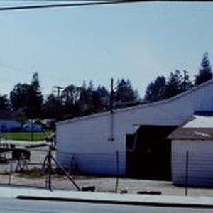 Slide, color transparency: The rear of Columbo Lumber Company on South Main Street at Palm Avenue in Sebastopol, April, 1978. Photo taken from Petaluma Avenue looking west.