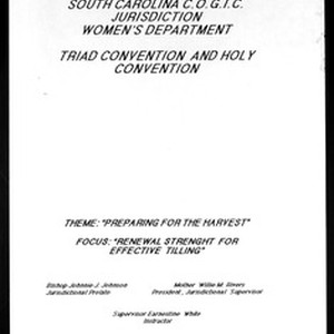 Triad convention & holy convocation, Women's Department, Church of God in Christ, John Wesley Wilson Institute, South Carolina, 1989?, title page, "Preparing for the harvest". [Description English/roman)]