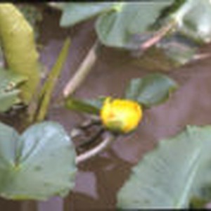 One yellow flower above water with half-submerged leaves.