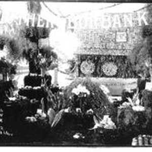 Postcard--photo--black and white: Sebastopol's Gravenstein Apple Show Luther Burbank display of apples and plants. Sign "1915" in apples. Postcard dated Aug3-9, 1914.