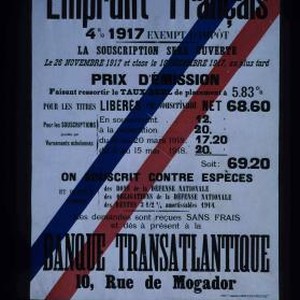 Emprunt francais. 4% 1917 exempt d'impot. La souscription sera ouverte le 26 novembre 1917 et close le 16 decembre 1917, au plus tard ... Les demandes sont recues sans frais et des a present a la Banque transatlantique, 10 rue de Mogador