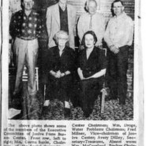 Photo--black and white, from newspaper clipping: Photo of Executive Committee of Jonive Farm Bureau Center. Seated L-R: Mrs. Gretta Banks, Chairman of Social Committee, and Mrs Wm Droge, Chairman of Farm Bureau Women of Jonive Center. Standing L-R: Ivan T. Roberts, Center Chairman; William Droge, Water Problems Chairman; Fred Milner, Vice-chairman of Jonive Center; Avery Dilley, Secretary-Treasurer. Absent members: Wm McCausland, Poultry Chairman; Harold Cowger, Chairman of Tax & Legislative Committee and Desmond S. Royer, Chairman of the Apple Section.