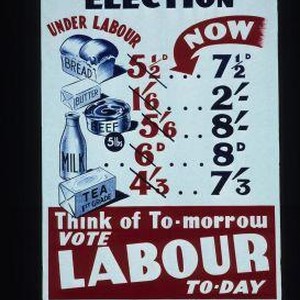 Cost of living election. Under Labour. Now. Bread. Butter. Milk... Think of to-morrow. Vote Labour to-day