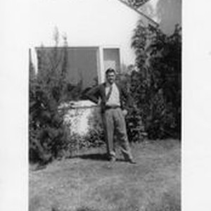 Photo, black and white: Donald Hallberg in front of the Hallberg family home on Oak Grove Avenue.