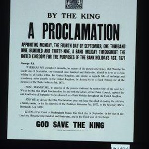 By the King, a proclamation, appointing Monday, the fourth day of September, one thousand nine hundred and thirty-nine, a bank holiday throughout the United Kingdom for the purposes of the Bank Holidays Act, 1871 ... God save the King