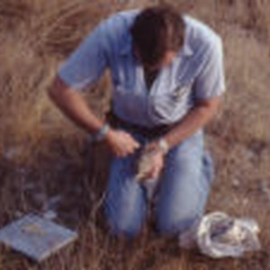 A man puts an ear tag on a desert cottontail.
