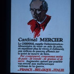 Cardinal Mercier. Le Cardinal Mercier supplie l'Administration-Alimentaire de venir en aide de suite, en expediant plus de vivres et de'aliments , aux millons de pauvres affames sur le point de morir de faim. Par consequent, consommez moins de pain - de viande - de graisse et de sucre. Augmentez autant que possible vos envois aux malheureuses victimes de la guerre, en France, en Belgique en Ilalie