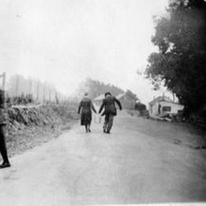 Photo--black and white: Unidentified people next to a hops field.