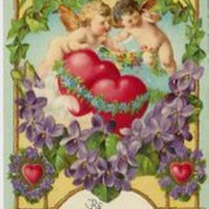 Postcard--colored picture: Valentine of two cherubs over two hearts surrounded by a heart of violets and ivy. Handwritten message on back to Bessie Springer of Graton from Albert in Sebastopol.Postmarked 1913 with 1 cent postage stamp.