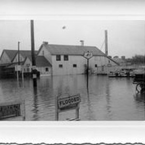 Photo--black and white: The flooded streets of east Sebastopol around the Sebastopol Road and Laguna area. 1951