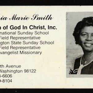 Gloria Marie Smith, International Sunday School Field Representative, Church of God in Christ, 1516 30th Avenue, Seattle, Washington, note, [s.d.], to Emma Crouch, written on the back of Smith's business card which includes Smith's picture. "Mother Crouch, I am glad you are here welcome, sincerely Gloria M. Smith". [Description English/roman)]