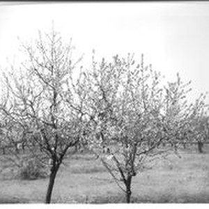 Photo--black and white: Fruit trees at Burbank Gold Ridge Experiment Farm. Various trees in bloom.