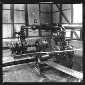 Photo--black and white: The P&SR Railroad sub station generator--powerhouse. The Powerhouse was built in 1903 and was the power source for the Petaluma & Santa Rosa Railroad which was an electric railway.
