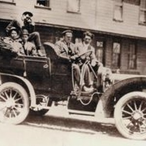 Photo--sepia: The first taxi in Sebastopol, Winton Auto, 1910. A driver with cap and goggels along with four young men are seated in the taxi.