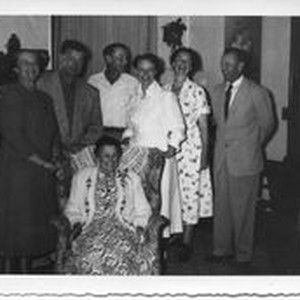 Photo, black and white: Grandma Barlow surrounded by her 6 children. L -R: Bess Hallberg, Denman Barlow, Wilbur Barlow, Louise Barlow Fehrensen, Maude Barlow Newman, Leland Barlow. 1951