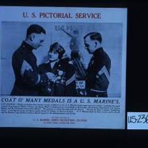 Coat o'many medals is a U.S. Marine's ... Would you believe that during a single enlistment in the U.S. Marine Corps a man won nine medals ... The sergeant is telling the pretty girl all about it. He tells her there's always "something doing" in the Marine Corps and there's great chance for display of dashing heroism. U.S. Marines fight on land, sea, and in the air ... Photo furnished by the United States Marine Corps recruiting station