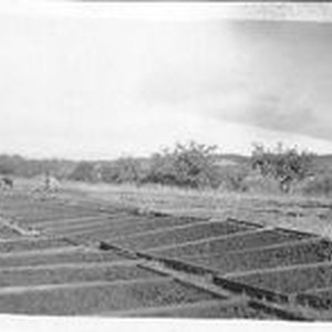 Print: black and white: Dick Richard's Dry Yard of Prunes in Windsor. Large drying racks filled with prunes are lined up on the ground. Two men in background working on the racks. about 1920's