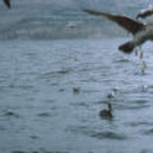 Some pelicans and gulls are sitting on the surface of the water while others fly overhead.